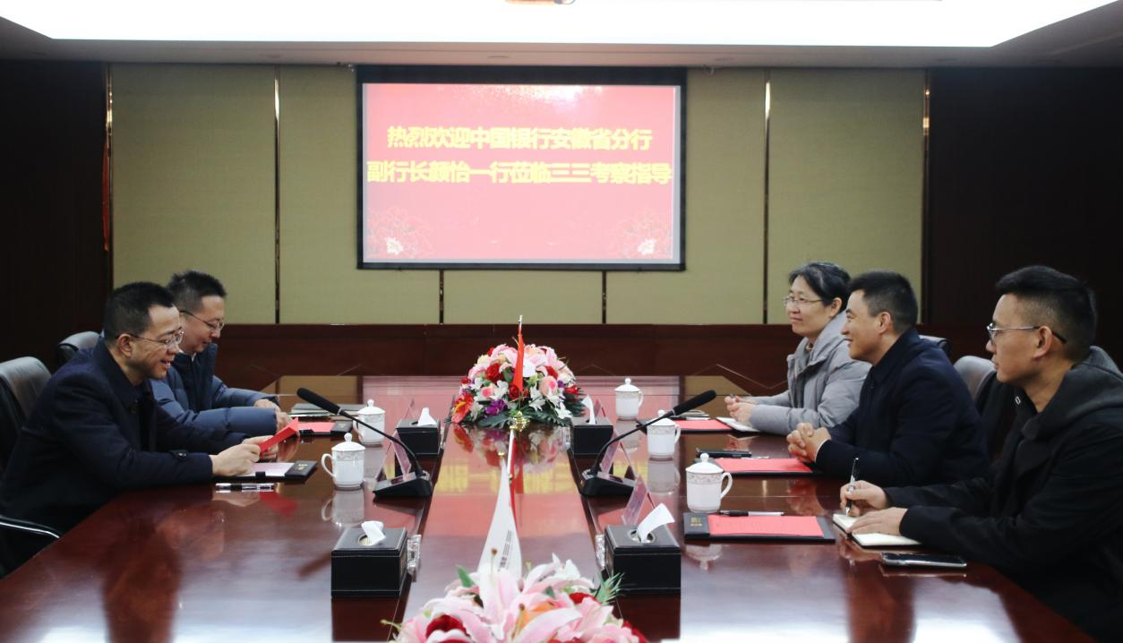 2024年12月30日下午,中國銀行安徽省分行副行長、合肥分行行長顏怡,中國銀行合肥高新區支行行長梁慶慶一行蒞臨三三集團考察調研。安徽三三集團執行董事、總裁宋曉光率集團副總裁、計劃財務中心總監陸曉鋼、金融管理中心總監朱艷共同接待了來賓一行。